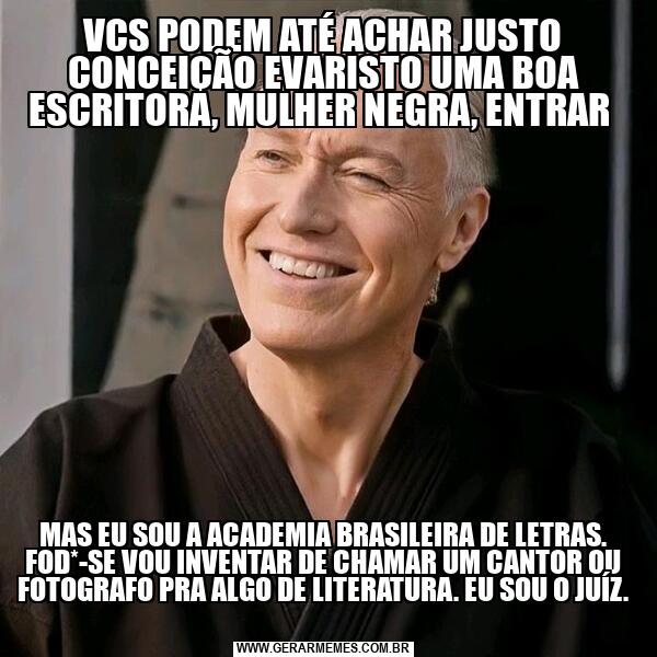 VCS PODEM ATÉ ACHAR JUSTO CONCEIÇÃO EVARISTO UMA BOA ESCRITORA, MULHER NEGRA, ENTRAR MAS EU SOU A ACADEMIA BRASILEIRA DE LETRAS. FOD*-SE VOU INVENTAR DE CHAMAR UM CANTOR OU FOTOGRAFO PRA ALGO DE LITERATURA. EU SOU O JUÍZ.