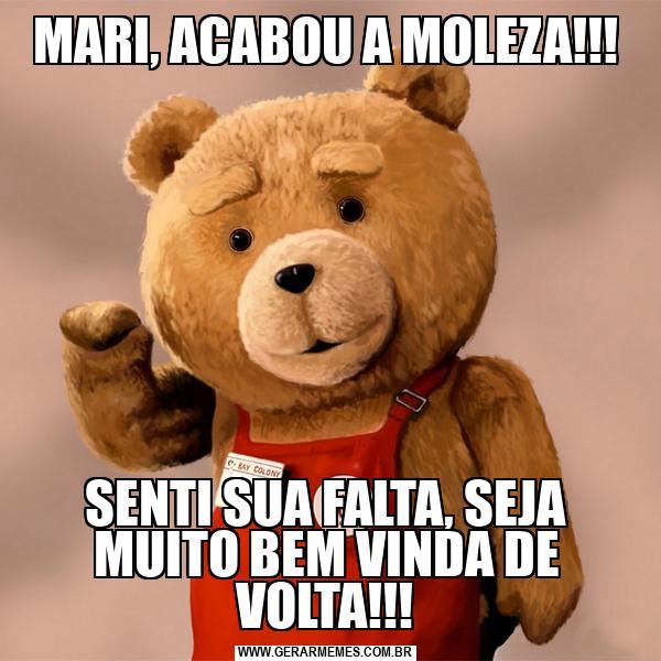 MARI, ACABOU A MOLEZA!!! SENTI SUA FALTA, SEJA MUITO BEM VINDA DE VOLTA!!!