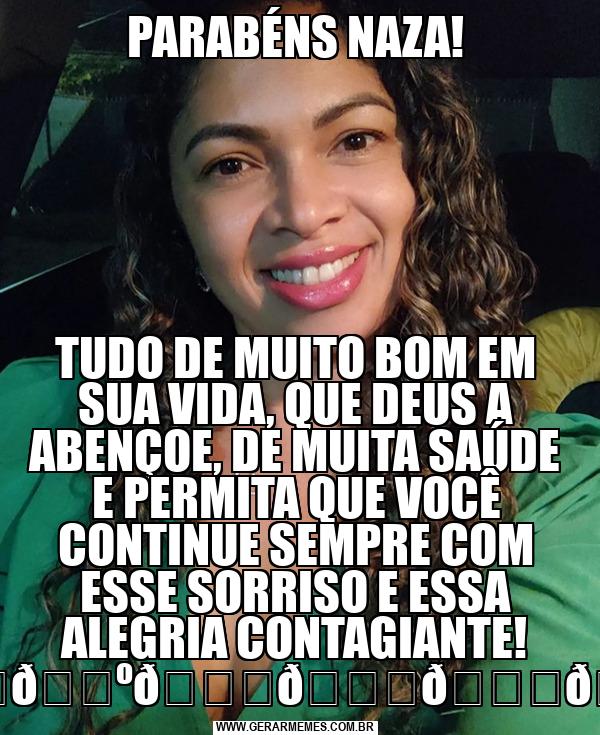 PARABÉNS NAZA! TUDO DE MUITO BOM EM SUA VIDA, QUE DEUS A ABENÇOE, DE MUITA SAÚDE E PERMITA QUE VOCÊ CONTINUE SEMPRE COM ESSE SORRISO E ESSA ALEGRIA CONTAGIANTE!