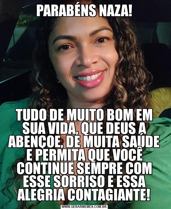 PARABÉNS NAZA! TUDO DE MUITO BOM EM SUA VIDA, QUE DEUS A ABENÇOE, DE MUITA SAÚDE E PERMITA QUE VOCÊ CONTINUE SEMPRE COM ESSE SORRISO E ESSA ALEGRIA CONTAGIANTE!