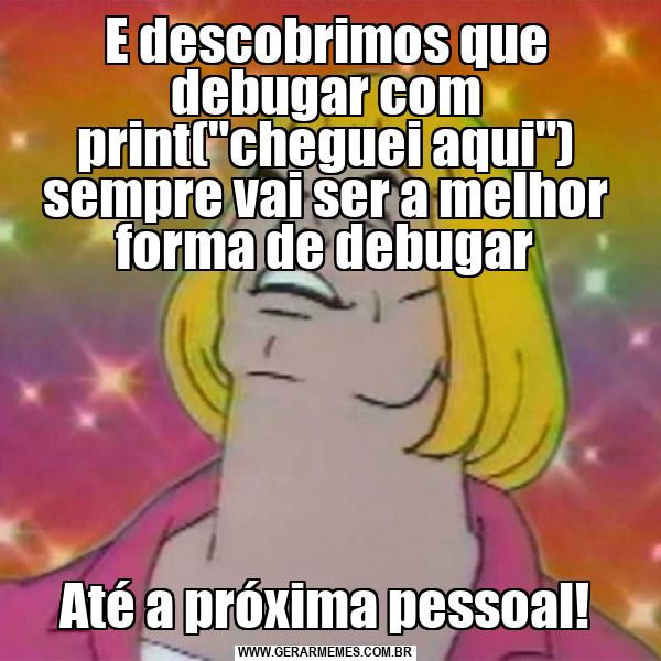 E descobrimos que debugar com print("cheguei aqui") sempre vai ser a melhor forma de debugar Até a próxima pessoal!
