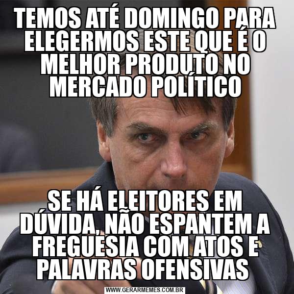 TEMOS ATÉ DOMINGO PARA ELEGERMOS ESTE QUE É O MELHOR PRODUTO NO MERCADO POLÍTICO SE HÁ ELEITORES EM DÚVIDA, NÃO ESPANTEM A FREGUESIA COM ATOS E PALAVRAS OFENSIVAS
