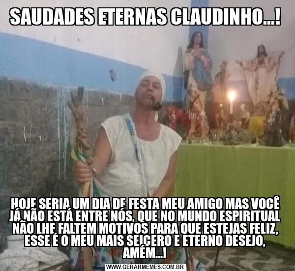 SAUDADES ETERNAS CLAUDINHO...! HOJE SERIA UM DIA DE FESTA MEU AMIGO MAS VOCÊ JÁ NÃO ESTÁ ENTRE NÓS, QUE NO MUNDO ESPIRITUAL NÃO LHE FALTEM MOTIVOS PARA QUE ESTEJAS FELIZ, ESSE É O MEU MAIS SEICERO E ETERNO DESEJO, AMÉM...!