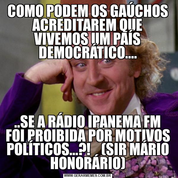 COMO PODEM OS GAÚCHOS ACREDITAREM QUE VIVEMOS UM PAÍS DEMOCRÁTICO.... ..SE A RÁDIO IPANEMA FM FOI PROIBIDA POR MOTIVOS POLÍTICOS...?! (SIR MÁRIO HONORÁRIO)