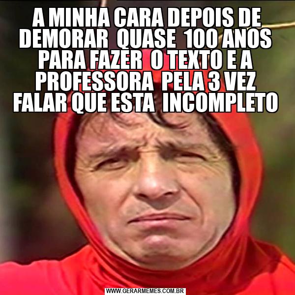 A MINHA CARA DEPOIS DE DEMORAR QUASE 100 ANOS PARA FAZER O TEXTO E A PROFESSORA PELA 3 VEZ FALAR QUE ESTA INCOMPLETO