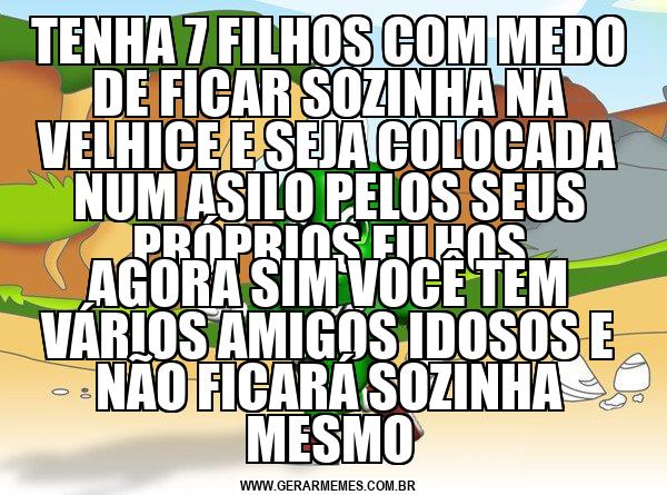 TENHA 7 FILHOS COM MEDO DE FICAR SOZINHA NA VELHICE E SEJA COLOCADA NUM ASILO PELOS SEUS PRÓPRIOS FILHOS AGORA SIM VOCÊ TEM VÁRIOS AMIGOS IDOSOS E NÃO FICARÁ SOZINHA MESMO