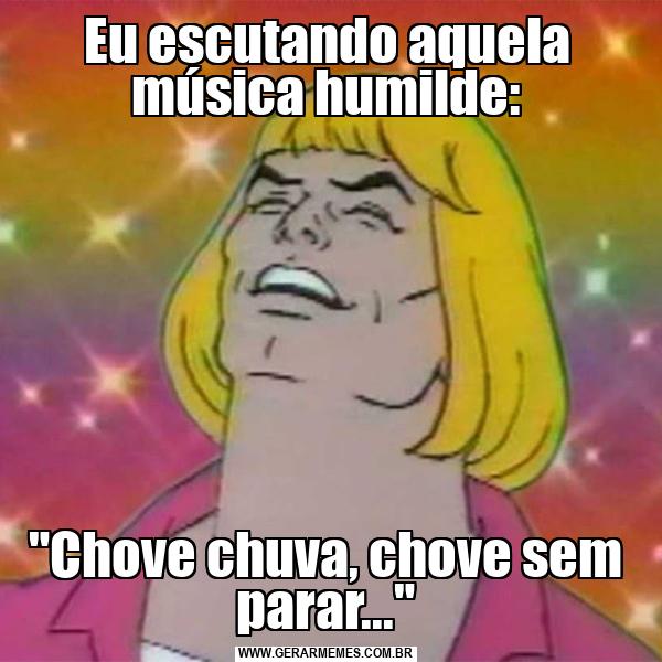 Eu escutando aquela música humilde: "Chove chuva, chove sem parar..."