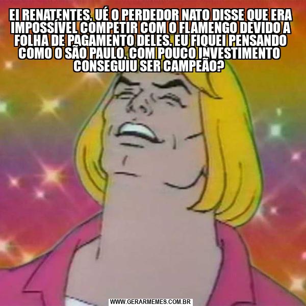EI RENATENTES, UÉ O PERDEDOR NATO DISSE QUE ERA IMPOSSÍVEL COMPETIR COM O FLAMENGO DEVIDO A FOLHA DE PAGAMENTO DELES. EU FIQUEI PENSANDO COMO O SÃO PAULO, COM POUCO INVESTIMENTO CONSEGUIU SER CAMPEÃO?