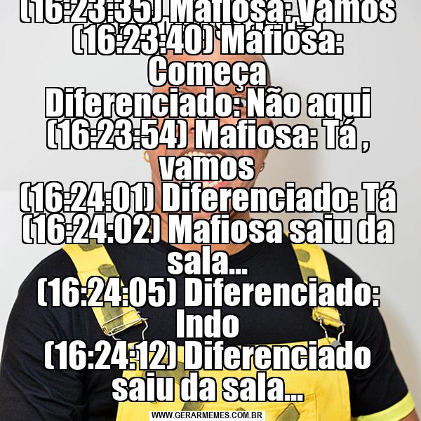 Mafiosa siririca Diferenciado fala para Todos: Vamos colar? (16:23:35) Mafiosa: Vamos (16:23:40) Mafiosa: Começa Diferenciado: Não aqui (16:23:54) Mafiosa: Tá , vamos (16:24:01) Diferenciado: Tá (16:24:02) Mafiosa saiu da sala... (16:24:05) Diferenciado: Indo