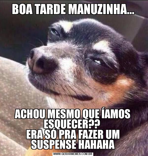 BOA TARDE MANUZINHA... ACHOU MESMO QUE ÍAMOS ESQUECER?? ERA SÓ PRA FAZER UM SUSPENSE HAHAHA