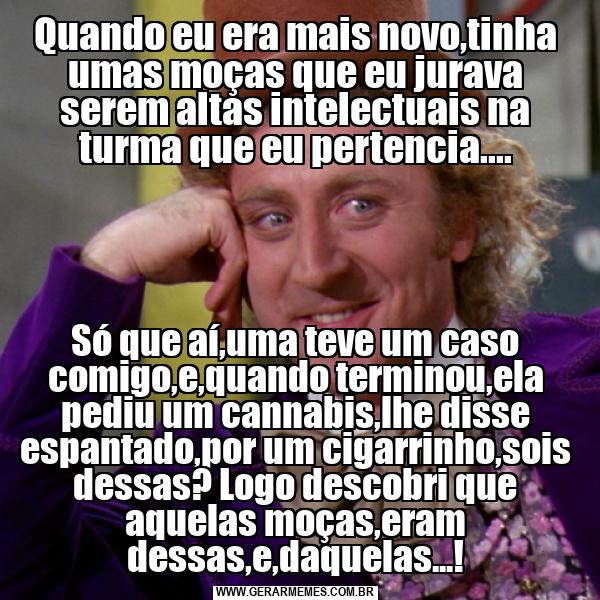 Quando eu era mais novo,tinha umas moças que eu jurava serem altas intelectuais na turma que eu pertencia.... Só que aí,uma teve um caso comigo,e,quando terminou,ela pediu um cannabis,lhe disse espantado,por um cigarrinho,sois dessas? Logo descobri que aquelas moças,eram dessas,e,daquelas...!