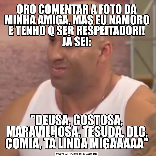 QRO COMENTAR A FOTO DA MINHA AMIGA, MAS EU NAMORO E TENHO Q SER RESPEITADOR!! JÁ SEI: "DEUSA, GOSTOSA, MARAVILHOSA, TESUDA, DLC, COMIA, TÁ LINDA MIGAAAAA"
