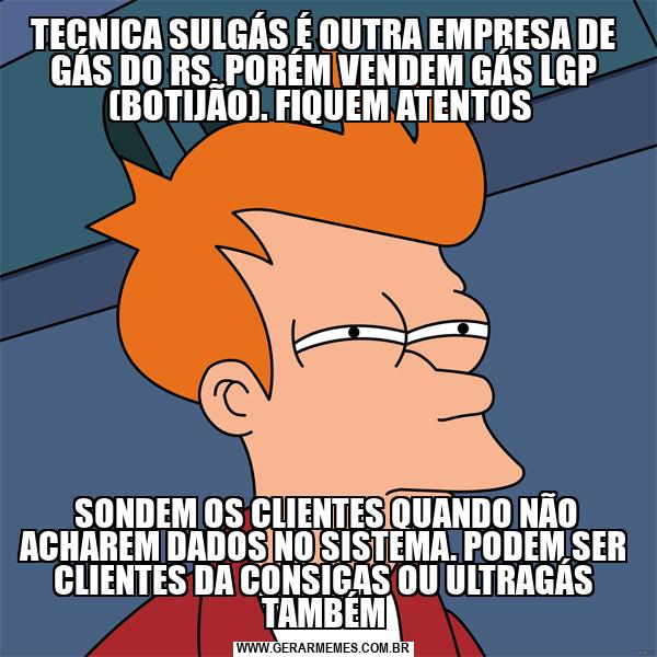 TECNICA SULGÁS É OUTRA EMPRESA DE GÁS DO RS, PORÉM VENDEM GÁS LGP (BOTIJÃO). FIQUEM ATENTOS SONDEM OS CLIENTES QUANDO NÃO ACHAREM DADOS NO SISTEMA. PODEM SER CLIENTES DA CONSIGAS OU ULTRAGÁS TAMBÉM