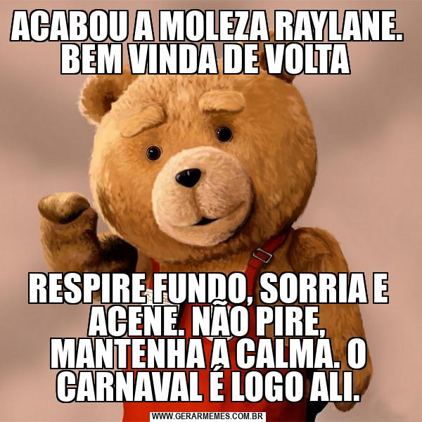 ACABOU A MOLEZA RAYLANE. BEM VINDA DE VOLTA RESPIRE FUNDO, SORRIA E ACENE. NÃO PIRE, MANTENHA A CALMA. O CARNAVAL É LOGO ALI.