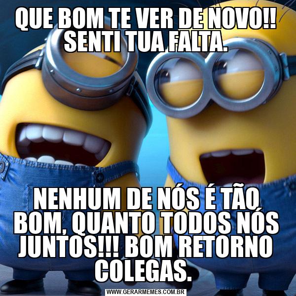 QUE BOM TE VER DE NOVO!! SENTI TUA FALTA. NENHUM DE NÓS É TÃO BOM, QUANTO TODOS NÓS JUNTOS!!! BOM RETORNO COLEGAS.