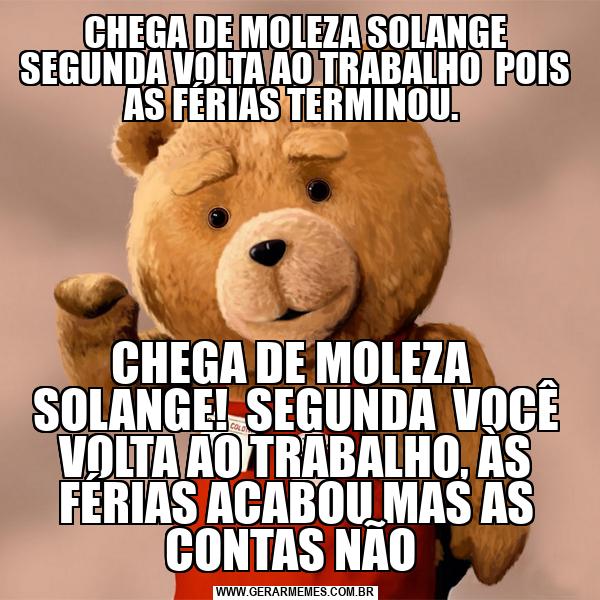 CHEGA DE MOLEZA SOLANGE SEGUNDA VOLTA AO TRABALHO POIS AS FÉRIAS TERMINOU. CHEGA DE MOLEZA SOLANGE! SEGUNDA VOCÊ VOLTA AO TRABALHO, ÀS FÉRIAS ACABOU MAS AS CONTAS NÃO