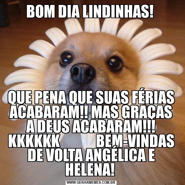 BOM DIA LINDINHAS! QUE PENA QUE SUAS FÉRIAS ACABARAM!! MAS GRAÇAS A DEUS ACABARAM!!! KKKKKK BEM-VINDAS DE VOLTA ANGÉLICA E HELENA!