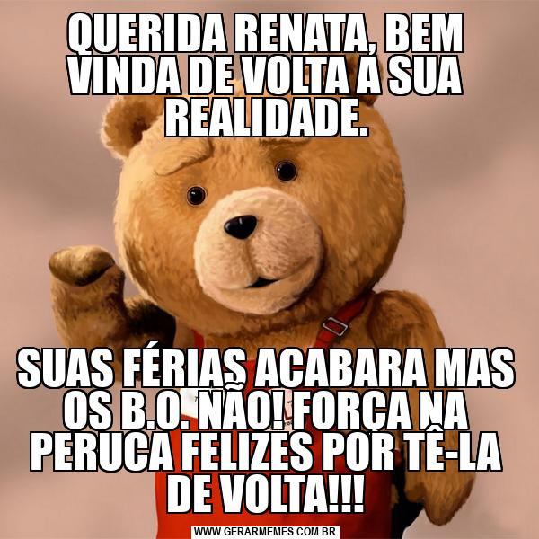 QUERIDA RENATA, BEM VINDA DE VOLTA A SUA REALIDADE. SUAS FÉRIAS ACABARA MAS OS B.O. NÃO! FORÇA NA PERUCA FELIZES POR TÊ-LA DE VOLTA!!!
