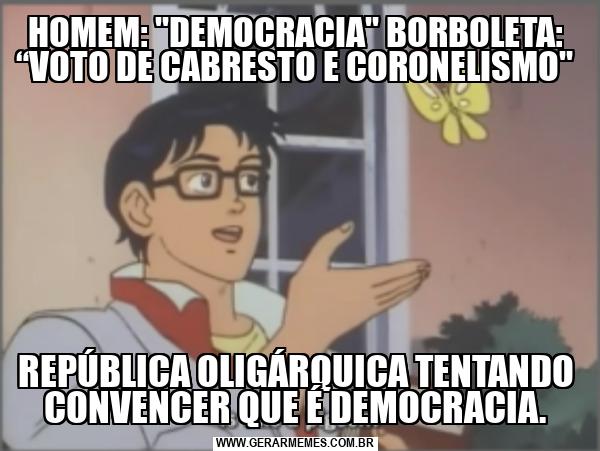 HOMEM: "DEMOCRACIA" BORBOLETA: “VOTO DE CABRESTO E CORONELISMO" REPÚBLICA OLIGÁRQUICA TENTANDO CONVENCER QUE É DEMOCRACIA.