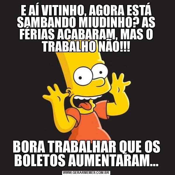 E AÍ VITINHO, AGORA ESTÁ SAMBANDO MIUDINHO? AS FÉRIAS ACABARAM, MAS O TRABALHO NÃO!!! BORA TRABALHAR QUE OS BOLETOS AUMENTARAM...