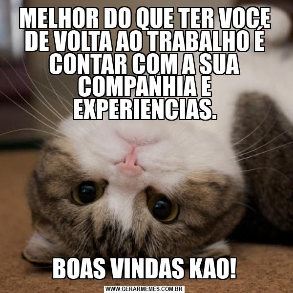 MELHOR DO QUE TER VOCE DE VOLTA AO TRABALHO É CONTAR COM A SUA COMPANHIA E EXPERIENCIAS. BOAS VINDAS KAO!
