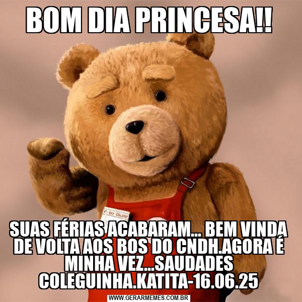 BOM DIA PRINCESA!! SUAS FÉRIAS ACABARAM... BEM VINDA DE VOLTA AOS BOS DO CNDH.AGORA É MINHA VEZ...SAUDADES COLEGUINHA.KATITA-16.06.25