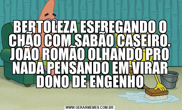BERTOLEZA ESFREGANDO O CHÃO COM SABÃO CASEIRO. JOÃO ROMÃO OLHANDO PRO NADA PENSANDO EM VIRAR DONO DE ENGENHO