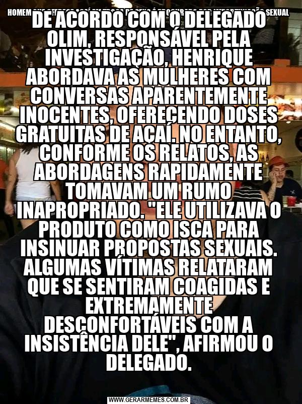HOMEM QUE OFERECE AÇAÍ EM TROCA DE SEXO É PROCURADO POR IMPORTUNAÇÃO SEXUAL EM SP APELIDADO DE "TARADO DO AÇAÍ", HENRIQUE ALEXANDRE, DE 31 ANOS, É ACUSADO DE ABORDAR MÃES SOLTEIRAS NA PORTA DE ESCOLAS. CASO É INVESTIGADO PELO DELEGADO OLIM. UM HOMEM IDENTIFICADO COMO HENRIQUE ALEXANDRE, DE 31 ANOS, ESTÁ SENDO PROCURAD