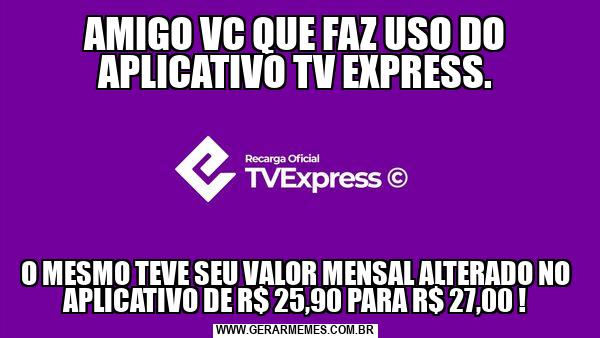 AMIGO VC QUE FAZ USO DO APLICATIVO TV EXPRESS. O MESMO TEVE SEU VALOR MENSAL ALTERADO NO APLICATIVO DE R$ 25,90 PARA R$ 27,00 !