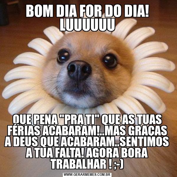 BOM DIA FOR DO DIA! LUUUUUU QUE PENA "PRA TI" QUE AS TUAS FÉRIAS ACABARAM!..MAS GRAÇAS A DEUS QUE ACABARAM..SENTIMOS A TUA FALTA! AGORA BORA TRABALHAR ! ;-)