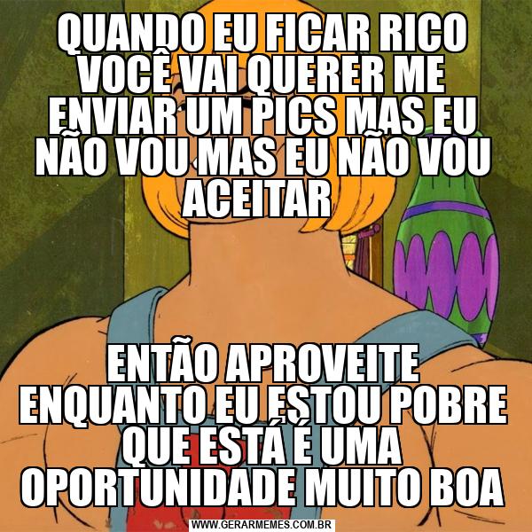 QUANDO EU FICAR RICO VOCÊ VAI QUERER ME ENVIAR UM PICS MAS EU NÃO VOU MAS EU NÃO VOU ACEITAR ENTÃO APROVEITE ENQUANTO EU ESTOU POBRE QUE ESTÁ É UMA OPORTUNIDADE MUITO BOA