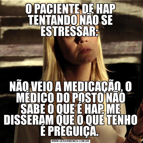 O PACIENTE DE HAP TENTANDO NÃO SE ESTRESSAR: NÃO VEIO A MEDICAÇÃO, O MÉDICO DO POSTO NÃO SABE O QUE É HAP, ME DISSERAM QUE O QUE TENHO É PREGUIÇA.