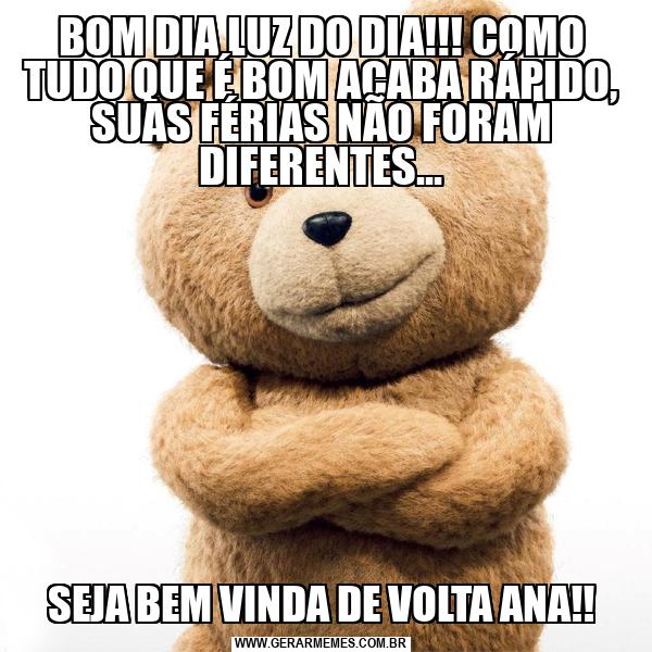 BOM DIA LUZ DO DIA!!! COMO TUDO QUE É BOM ACABA RÁPIDO, SUAS FÉRIAS NÃO FORAM DIFERENTES... SEJA BEM VINDA DE VOLTA ANA!!