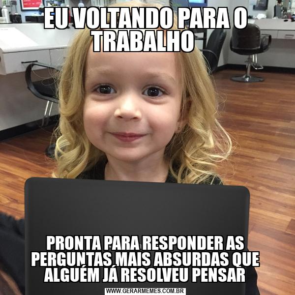 EU VOLTANDO PARA O TRABALHO PRONTA PARA RESPONDER AS PERGUNTAS MAIS ABSURDAS QUE ALGUÉM JÁ RESOLVEU PENSAR