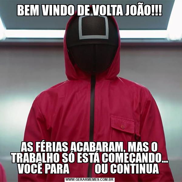 BEM VINDO DE VOLTA JOÃO!!! AS FÉRIAS ACABARAM, MAS O TRABALHO SÓ ESTÁ COMEÇANDO... VOCÊ PARA OU CONTINUA