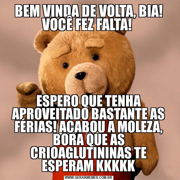 BEM VINDA DE VOLTA, BIA! VOCÊ FEZ FALTA! ESPERO QUE TENHA APROVEITADO BASTANTE AS FÉRIAS! ACABOU A MOLEZA, BORA QUE AS CRIOAGLUTININAS TE ESPERAM KKKKK