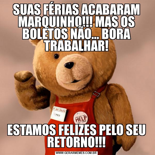 SUAS FÉRIAS ACABARAM MARQUINHO!!! MAS OS BOLETOS NÃO... BORA TRABALHAR! ESTAMOS FELIZES PELO SEU RETORNO!!!