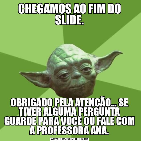 CHEGAMOS AO FIM DO SLIDE. OBRIGADO PELA ATENÇÃO... SE TIVER ALGUMA PERGUNTA GUARDE PARA VOCÊ OU FALE COM A PROFESSORA ANA.