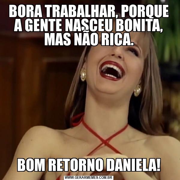 BORA TRABALHAR, PORQUE A GENTE NASCEU BONITA, MAS NÃO RICA. BOM RETORNO DANIELA!