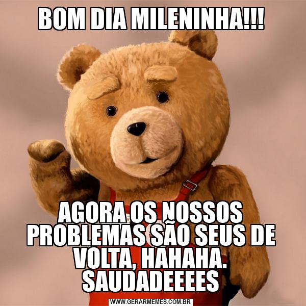 BOM DIA MILENINHA!!! AGORA OS NOSSOS PROBLEMAS SÃO SEUS DE VOLTA, HAHAHA. SAUDADEEEES