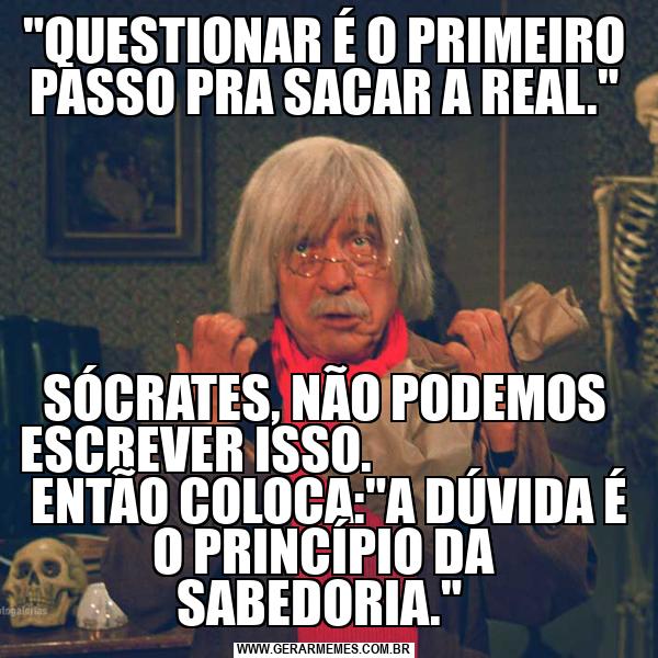 "QUESTIONAR É O PRIMEIRO PASSO PRA SACAR A REAL." SÓCRATES, NÃO PODEMOS ESCREVER ISSO. ENTÃO COLOCA:"A DÚVIDA É O PRINCÍPIO DA SABEDORIA."