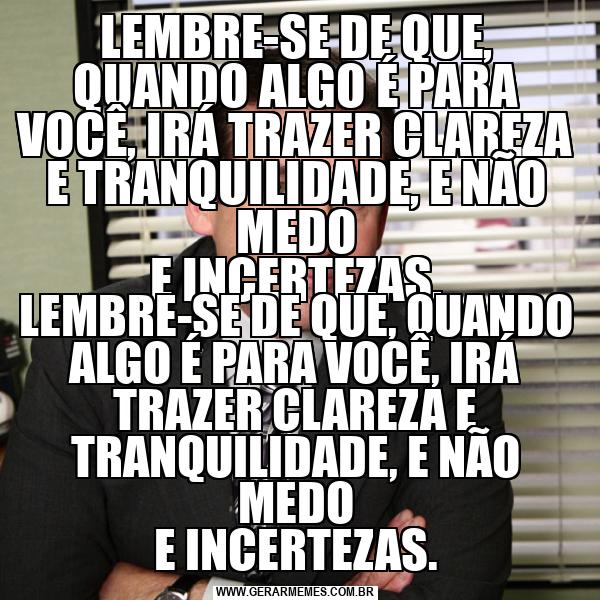 LEMBRE-SE DE QUE, QUANDO ALGO É PARA VOCÊ, IRÁ TRAZER CLAREZA E TRANQUILIDADE, E NÃO MEDO E INCERTEZAS. LEMBRE-SE DE QUE, QUANDO ALGO É PARA VOCÊ, IRÁ TRAZER CLAREZA E TRANQUILIDADE, E NÃO MEDO E INCERTEZAS.