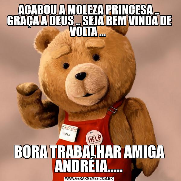 ACABOU A MOLEZA PRINCESA .. GRAÇA A DEUS .. SEJA BEM VINDA DE VOLTA ... BORA TRABALHAR AMIGA ANDRÉIA.....