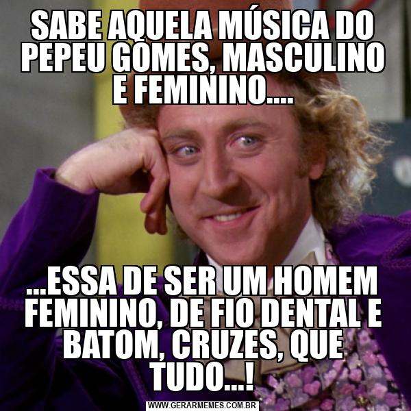 SABE AQUELA MÚSICA DO PEPEU GOMES, MASCULINO E FEMININO.... ...ESSA DE SER UM HOMEM FEMININO, DE FIO DENTAL E BATOM, CRUZES, QUE TUDO...!