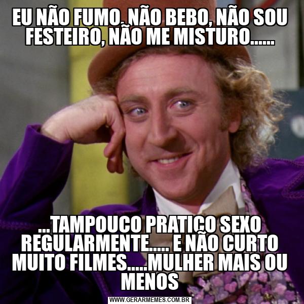 EU NÃO FUMO, NÃO BEBO, NÃO SOU FESTEIRO, NÃO ME MISTURO...... ...TAMPOUCO PRATICO SEXO REGULARMENTE..... E NÃO CURTO MUITO FILMES.....MULHER MAIS OU MENOS