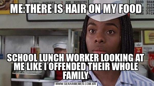 ME:THERE IS HAIR ON MY FOOD SCHOOL LUNCH WORKER LOOKING AT ME LIKE I OFFENDED THEIR WHOLE FAMILY
