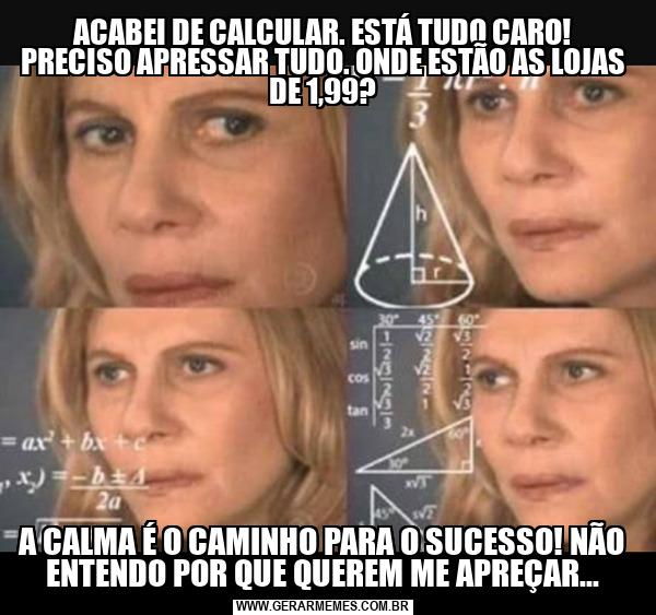 ACABEI DE CALCULAR. ESTÁ TUDO CARO! PRECISO APRESSAR TUDO. ONDE ESTÃO AS LOJAS DE 1,99? A CALMA É O CAMINHO PARA O SUCESSO! NÃO ENTENDO POR QUE QUEREM ME APREÇAR...