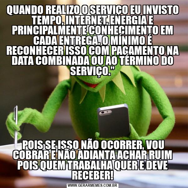 QUANDO REALIZO O SERVIÇO EU INVISTO TEMPO, INTERNET, ENERGIA E PRINCIPALMENTE CONHECIMENTO EM CADA ENTREGA. O MÍNIMO É RECONHECER ISSO COM PAGAMENTO NA DATA COMBINADA OU AO TÉRMINO DO SERVIÇO.” POIS SE ISSO NÃO OCORRER, VOU COBRAR E NÃO ADIANTA ACHAR RUIM POIS QUEM TRABALHA QUER E DEVE RECEBER!