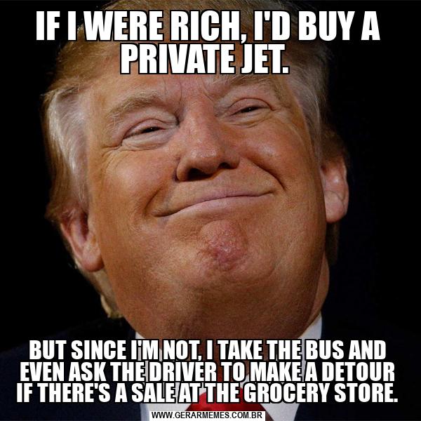 IF I WERE RICH, I'D BUY A PRIVATE JET. BUT SINCE I'M NOT, I TAKE THE BUS AND EVEN ASK THE DRIVER TO MAKE A DETOUR IF THERE'S A SALE AT THE GROCERY STORE.