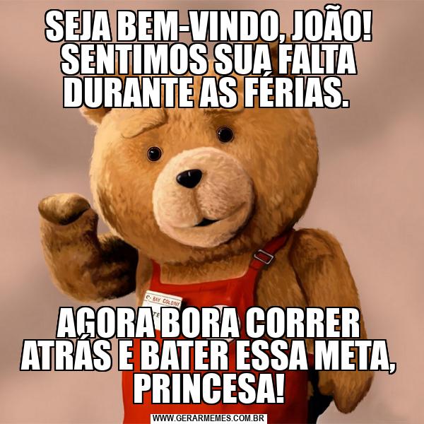SEJA BEM-VINDO, JOÃO! SENTIMOS SUA FALTA DURANTE AS FÉRIAS. AGORA BORA CORRER ATRÁS E BATER ESSA META, PRINCESA!